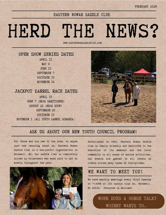 We would like to invite you to take a look around! Browse our pages and see what the Eastern Rowan Saddle Club has to offer. Do you have questions? We love questions! Please contact us so we can make your visit pleasant and memorable!